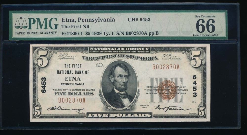 One 1929 $5 Pennsylvania National Bank Note PMG 66EPQ.