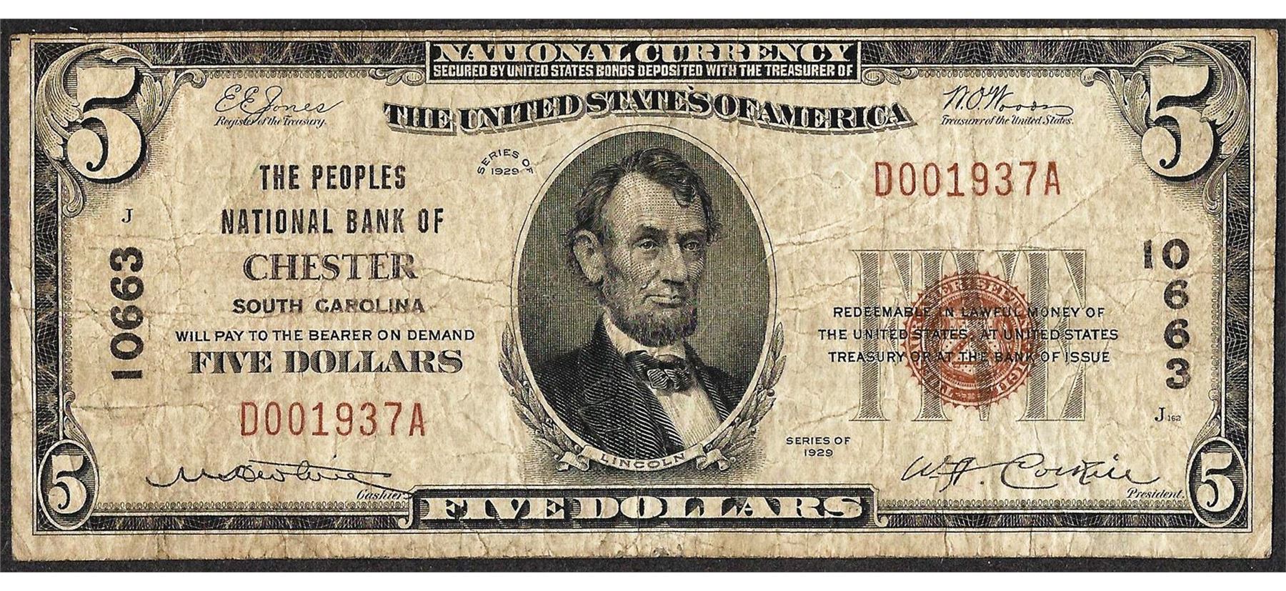 One 1929 $5 Peoples NB of Chester, SC CH# 10663 National Currency Note.