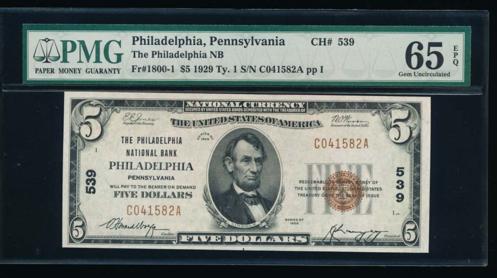 One 1929 $5 Philadelphia National Bank Note PMG 65EPQ.