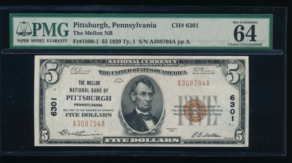 One 1929 $5 Pittsburgh National Bank Note PMG 64EPQ.