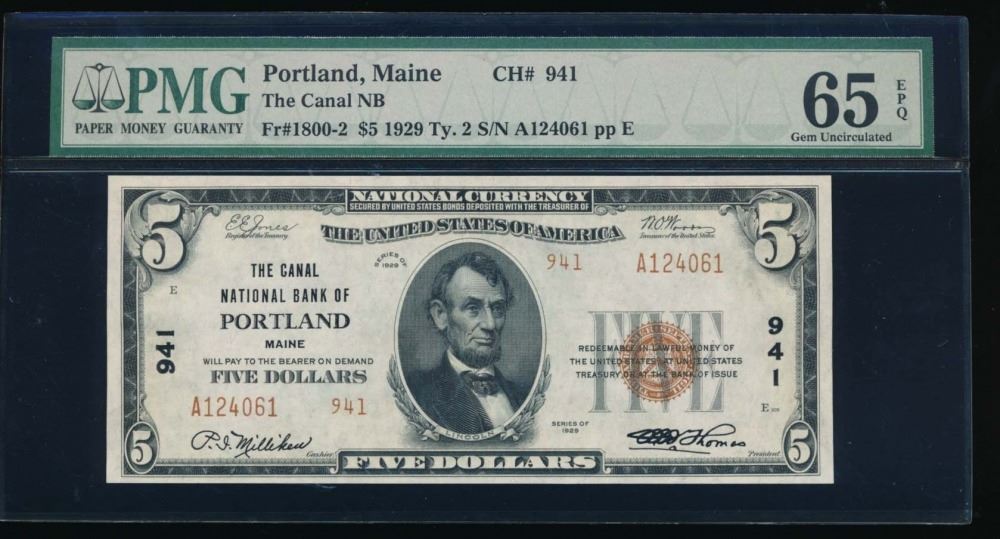 One 1929 $5 Portland ME National PMG 65EPQ.