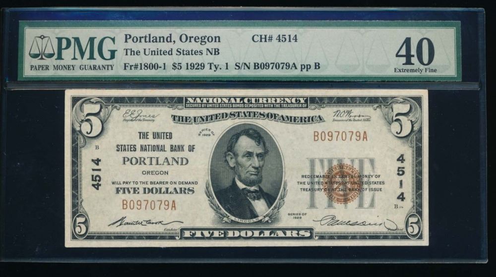One 1929 $5 Portland National Bank Note PMG 40.