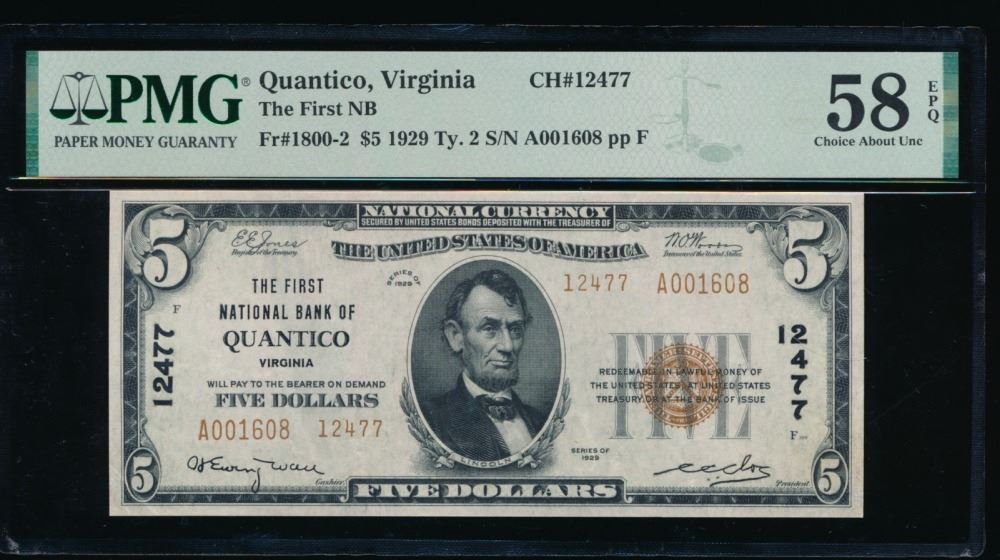 One 1929 $5 Quantico VA National PMG 58EPQ.
