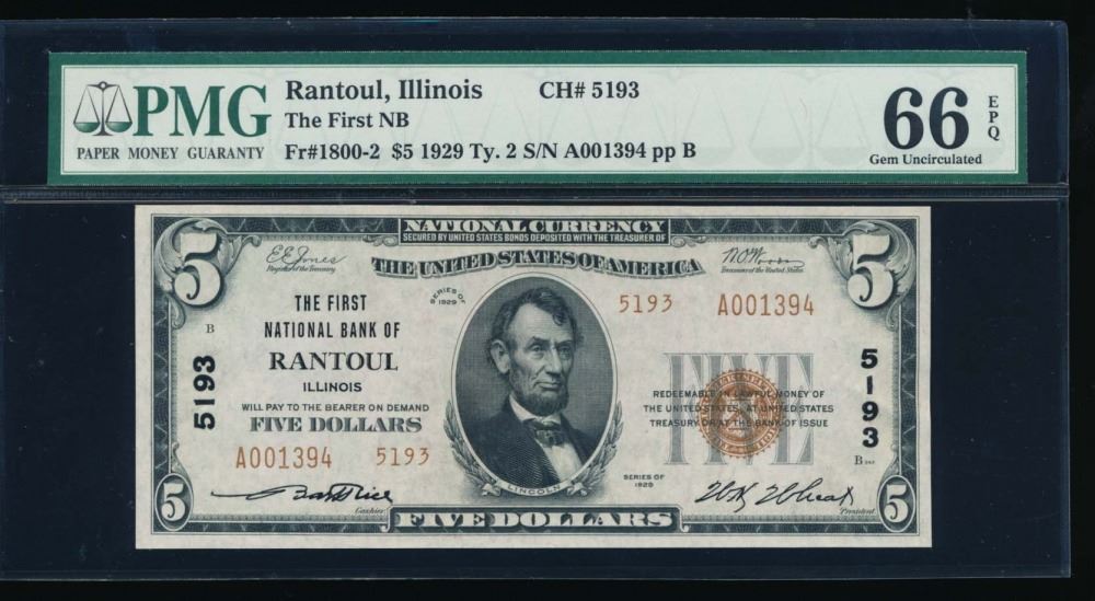 One 1929 $5 Rantoul National Bank Note PMG 66EPQ.