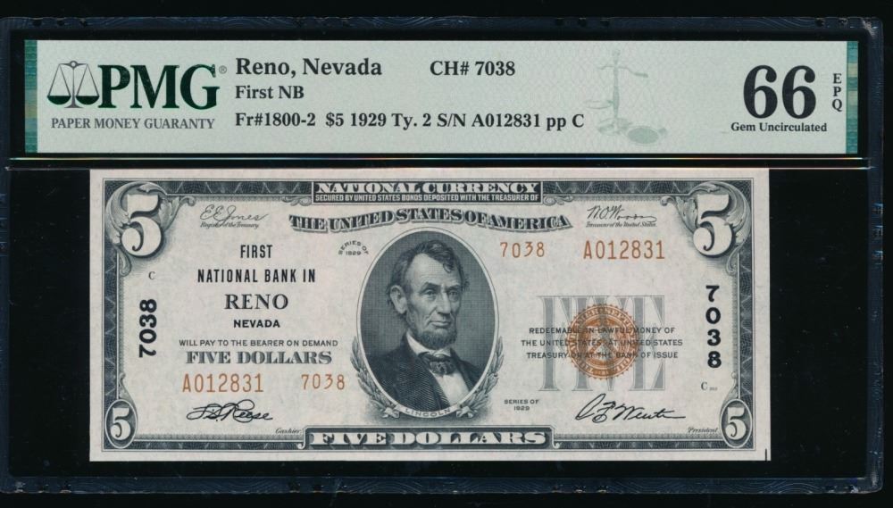 One 1929 $5 Reno NV National PMG 66EPQ.