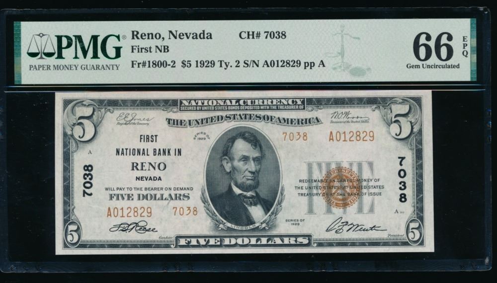 One 1929 $5 Reno NV National PMG 66EPQ.