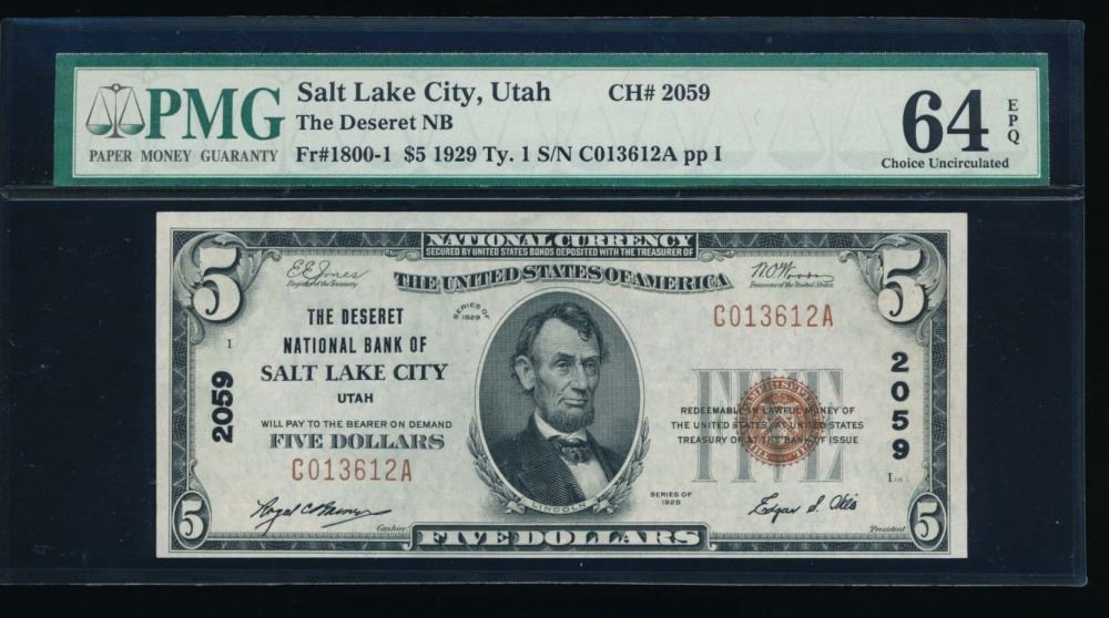 One 1929 $5 Salt Lake City National Bank Note PMG 64EPQ.