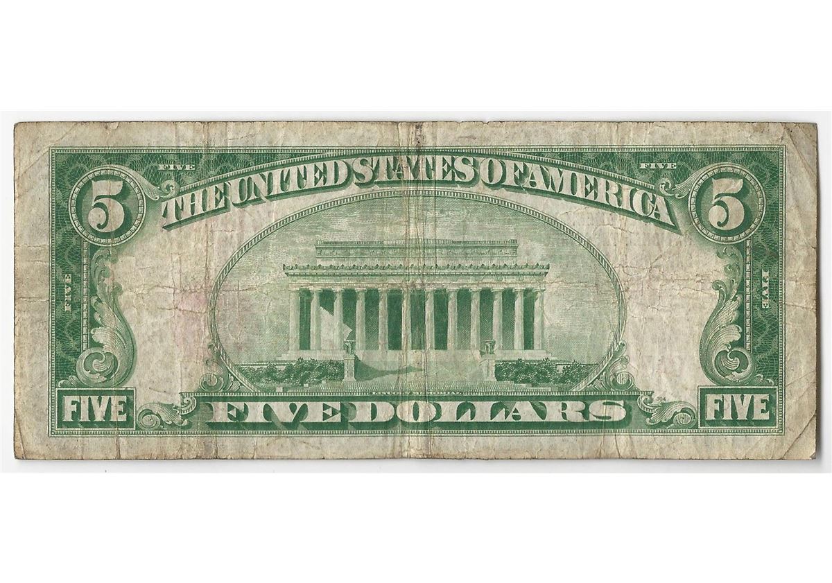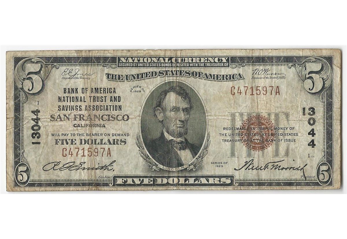 One 1929 $5 San Francisco California National Currency Note.