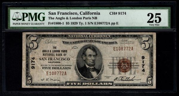One 1929 $5 San Francisco National Bank Note PMG 25.
