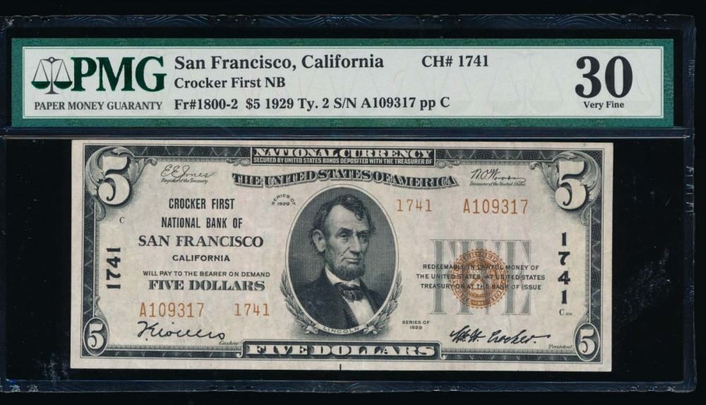 One 1929 $5 San Francisco National Bank Note PMG 30.
