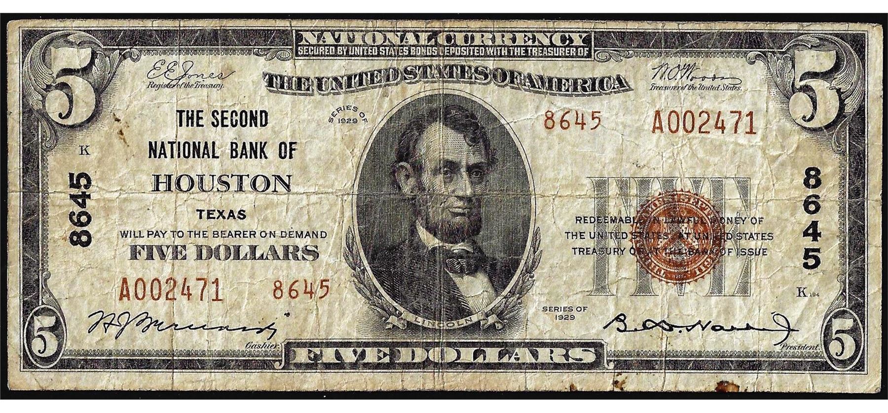 1929 $5 Second National Bank of Houston, Texas CH# 8645 National Currency Note