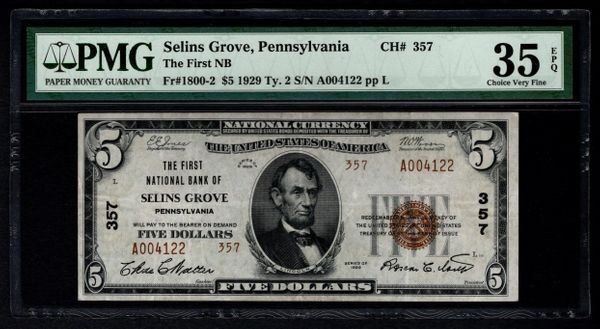 One 1929 $5 Selins Grove National Bank Note PMG 35EPQ.