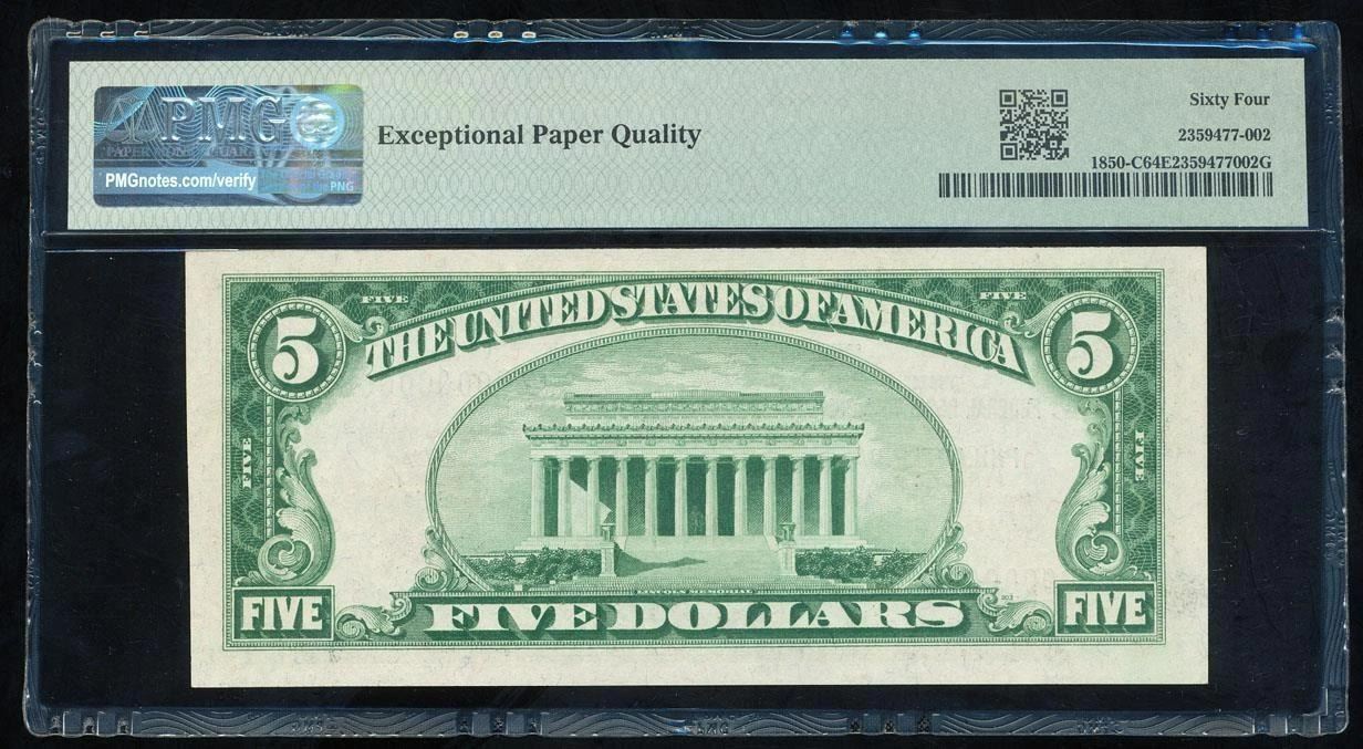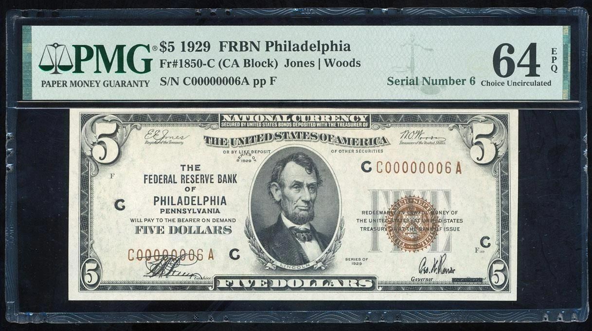 One 1929 $5 Serial 6 Philadelphia FRBN PMG 64EPQ.