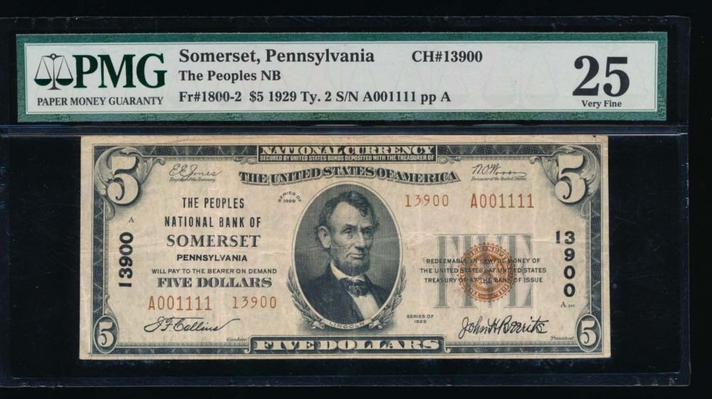 One 1929 $5 Somerset PA National Bank Note PMG 25.