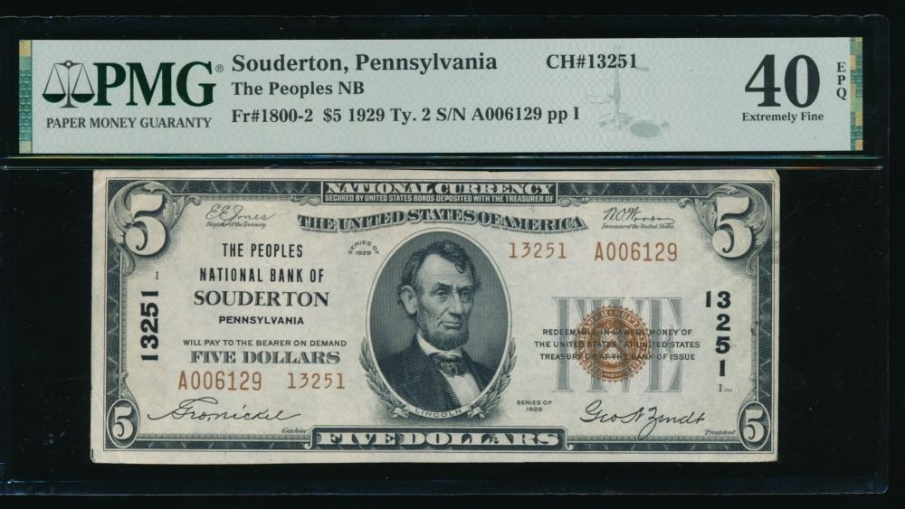 One 1929 $5 Souderton PA National PMG 40EPQ.