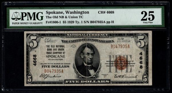 One 1929 $5 Spokane National Bank Note PMG 25.