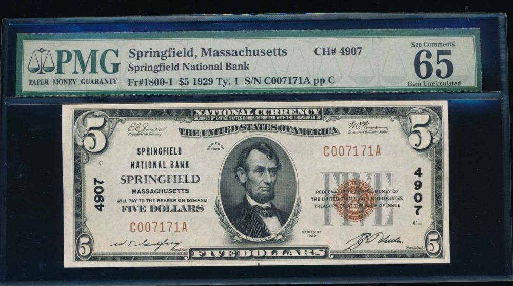 One 1929 $5 Springfield National Bank Note PMG 65EPQ.