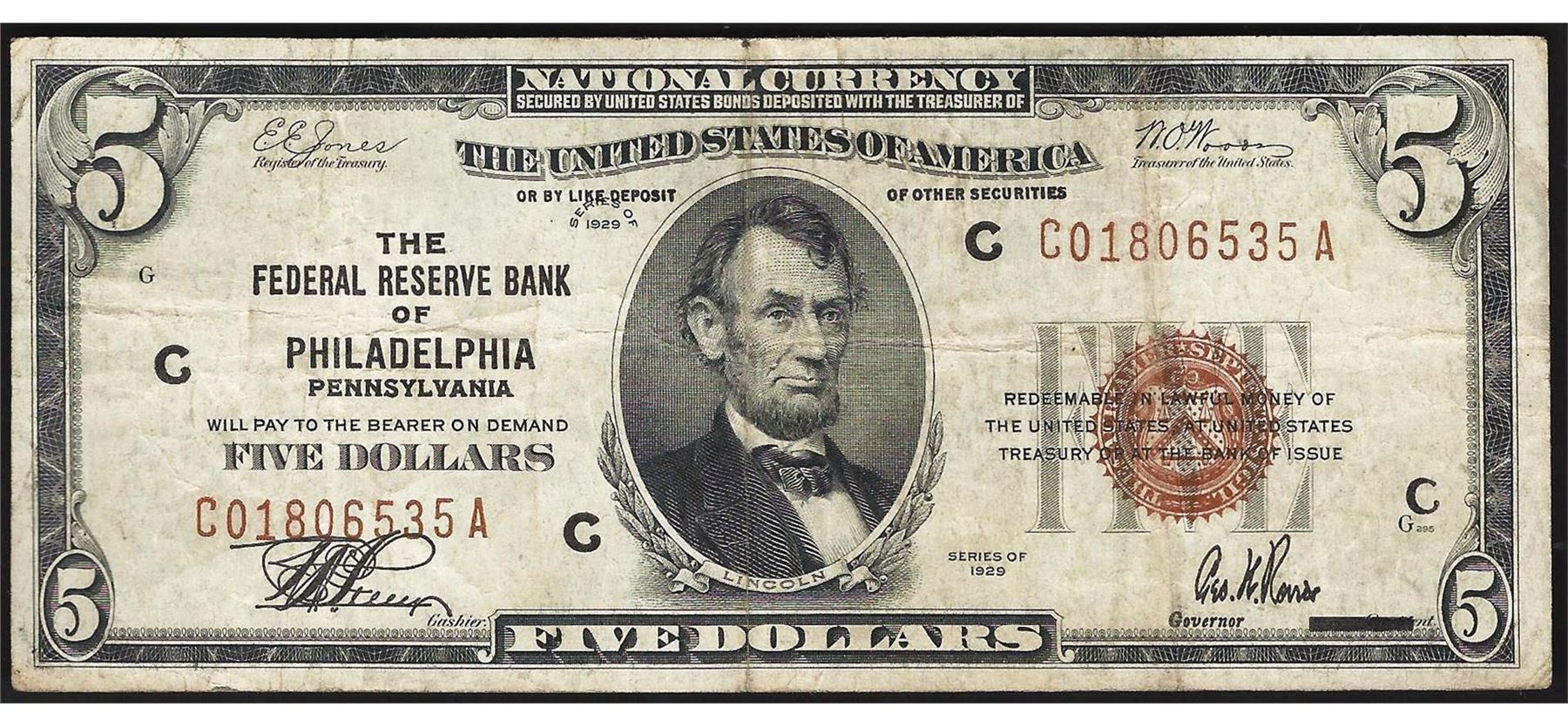 One 1929 $5 The Federal Reserve Bank of Philadelphia Note.