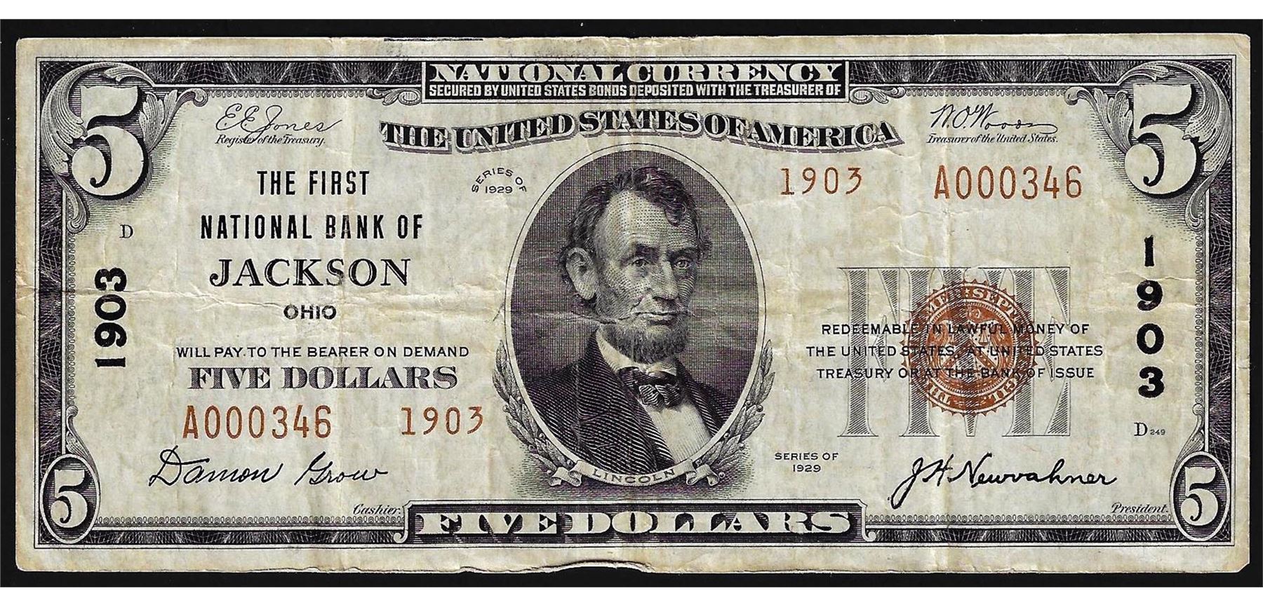 1929 $5 The First National Bank of Jackson OH National Currency Note CH# 1903
