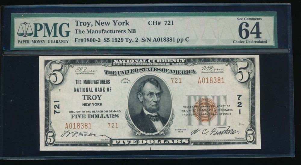One 1929 $5 Troy National Bank Note PMG 64EPQ.
