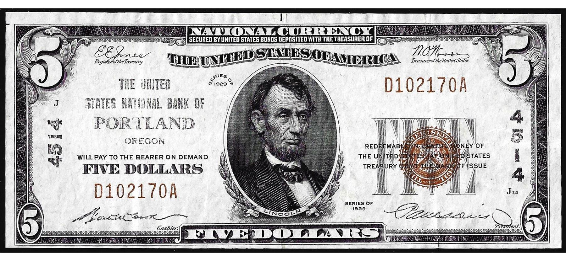 One 1929 $5 United States NB of Portland, OR CH# 4514 National Currency Note.