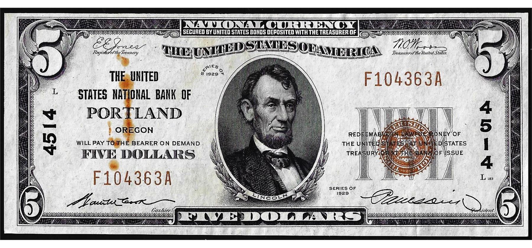One 1929 $5 United States National Bank of Portland, OR CH# 4514 National Currency Note.