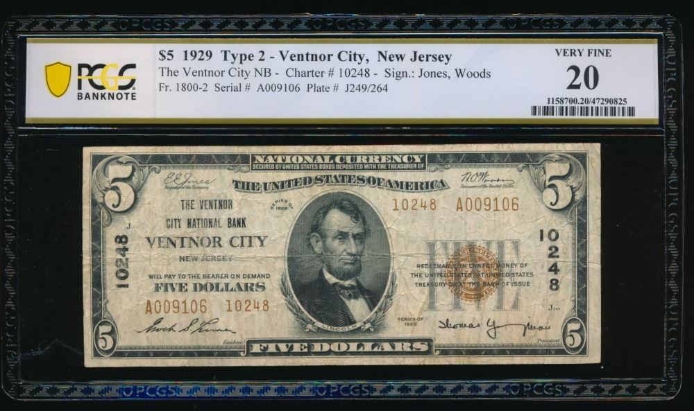 One 1929 $5 Ventnor NJ National PCGS 20.