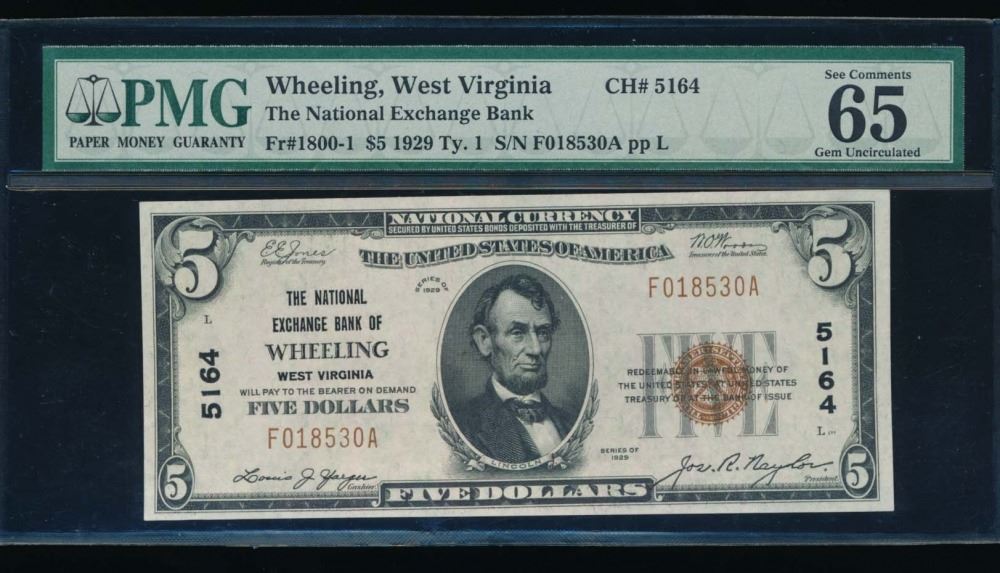 One 1929 $5 Wheeling National Bank Note PMG 65.