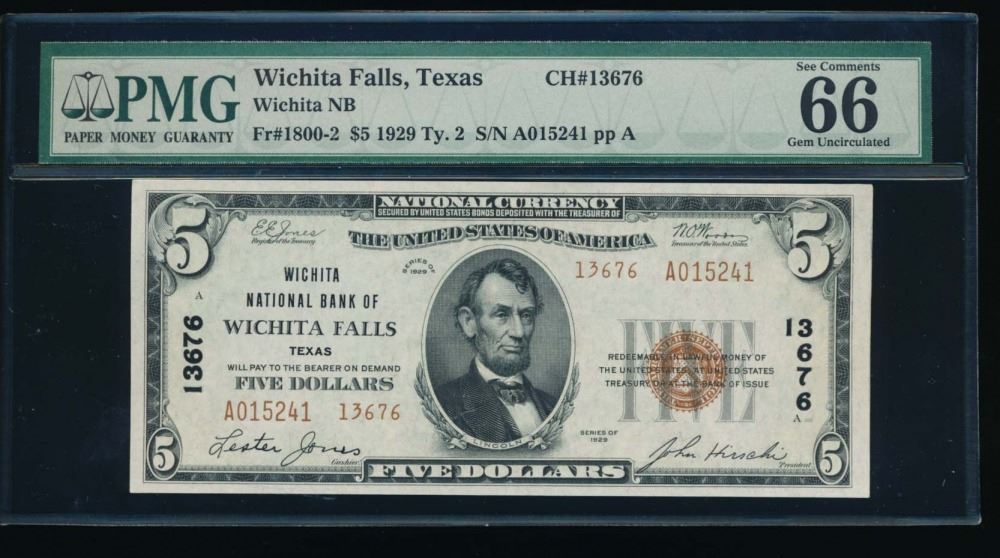 One 1929 $5 Wichita Falls National Bank Note PMG 66EPQ.