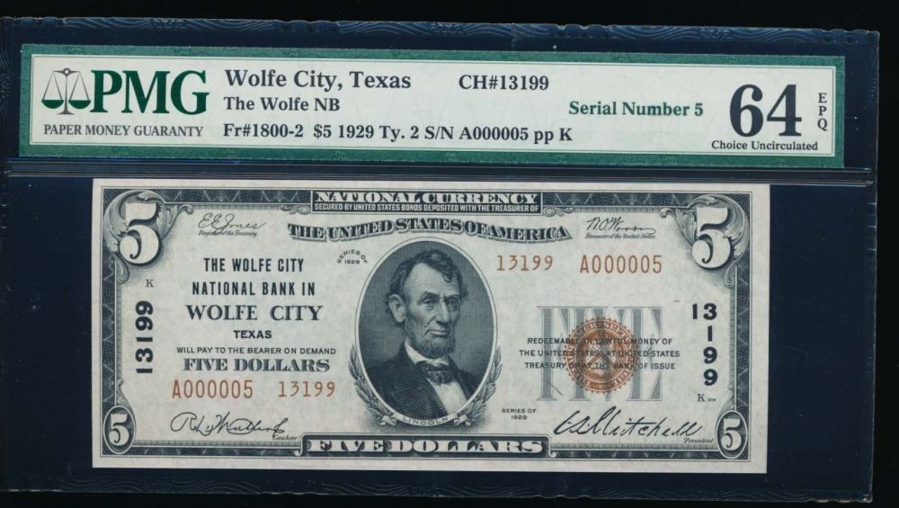 One 1929 $5 Wolfe City National Bank Note PMG 64EPQ Low Serial Number.