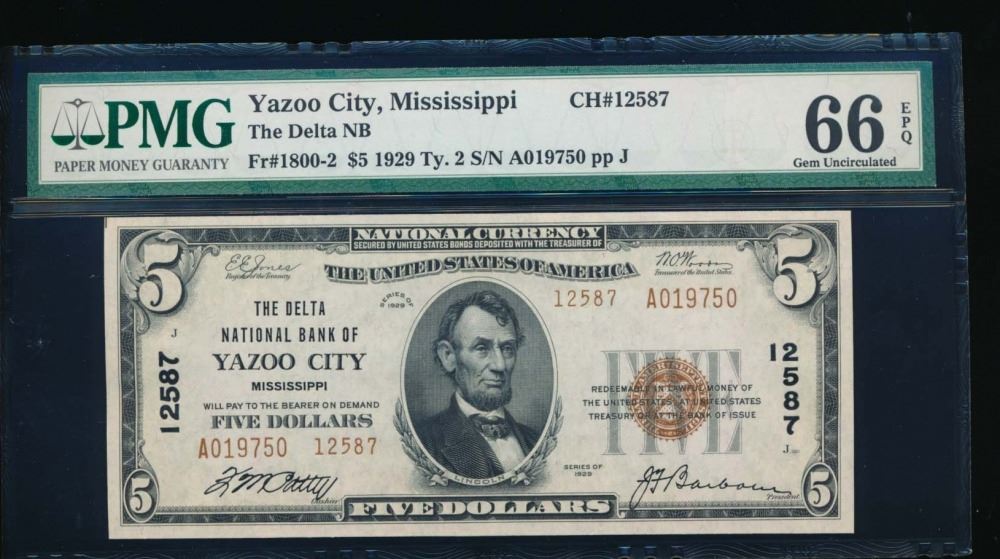 One 1929 $5 Yazoo City National Bank Note PMG 66EPQ.