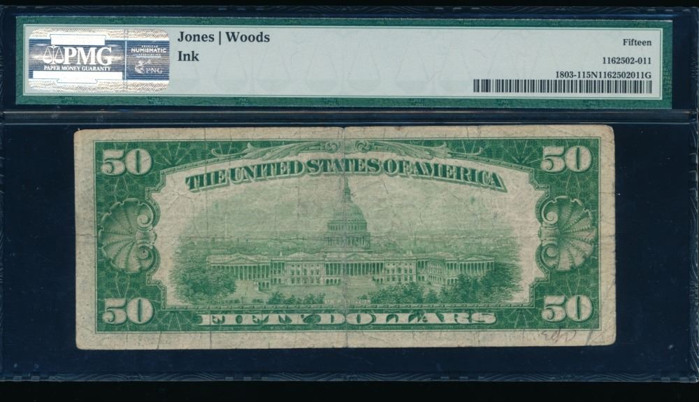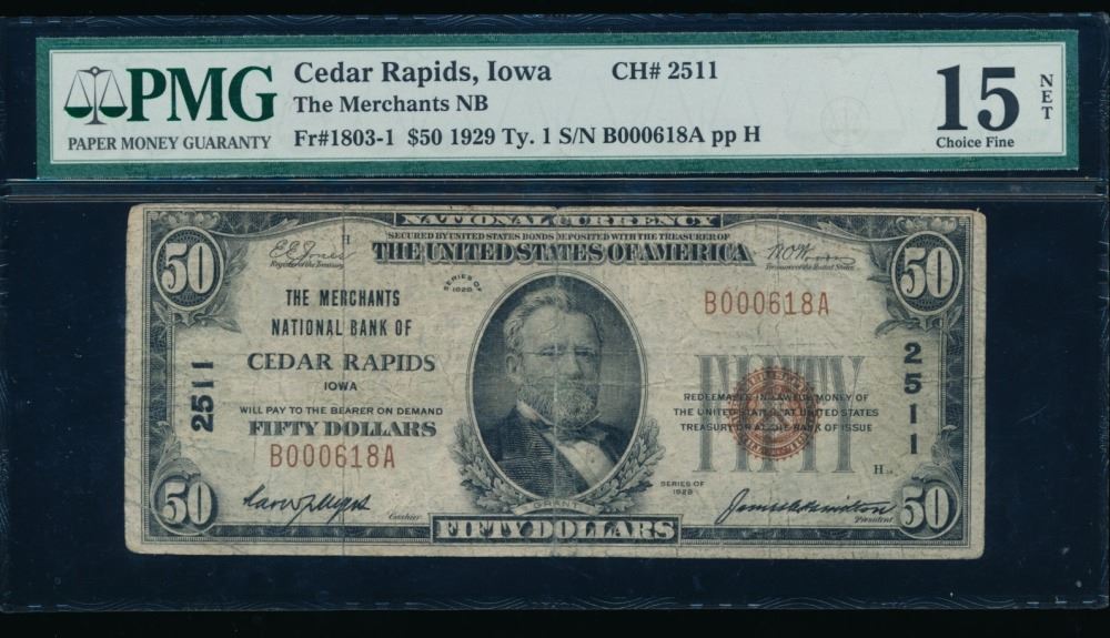 One 1929 $50 Cedar Rapids IA National PMG 15NET.