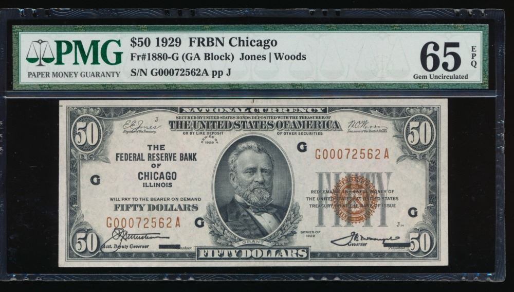 One 1929 $50 Chicago Federal Reserve Bank Note PMG 65EPQ.