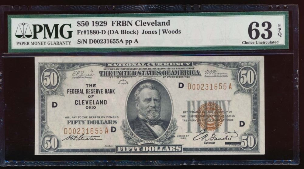 One 1929 $50 Cleveland Federal Reserve Bank Note PMG 63EPQ.