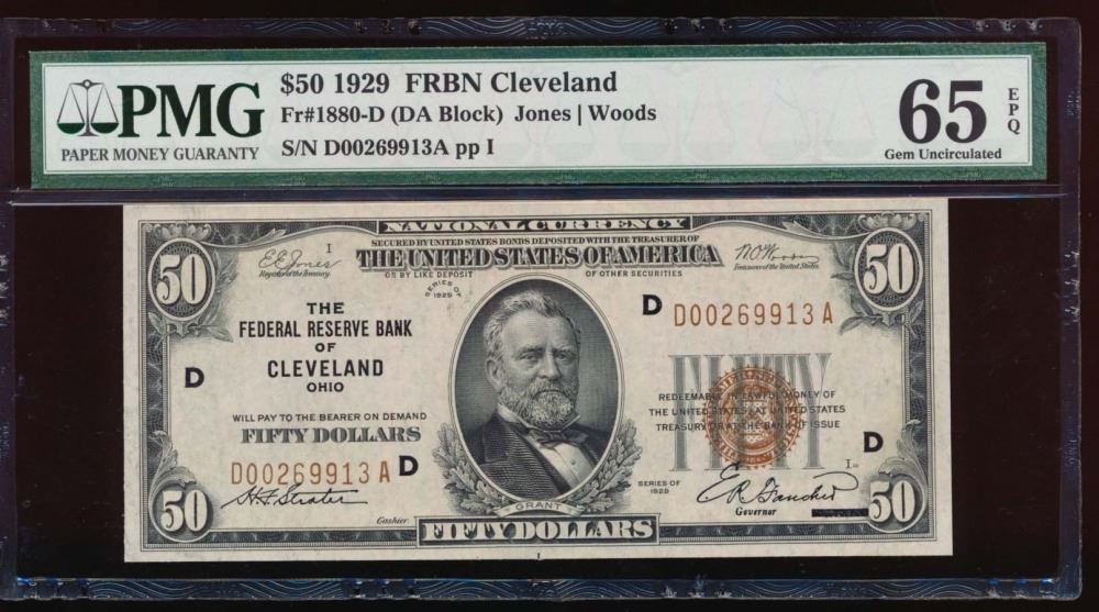 One 1929 $50 Cleveland Federal Reserve Bank Note PMG 65EPQ.