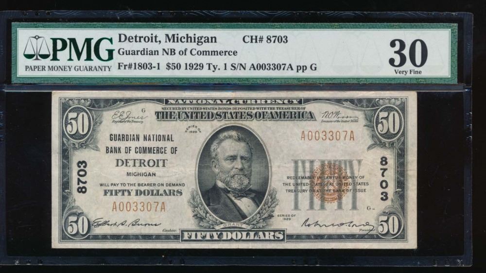 One 1929 $50 Detroit National Bank Note PMG 30.