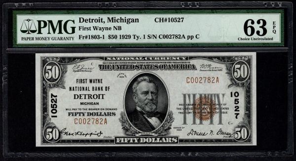 One 1929 $50 Detroit National Bank Note PMG 63EPQ.