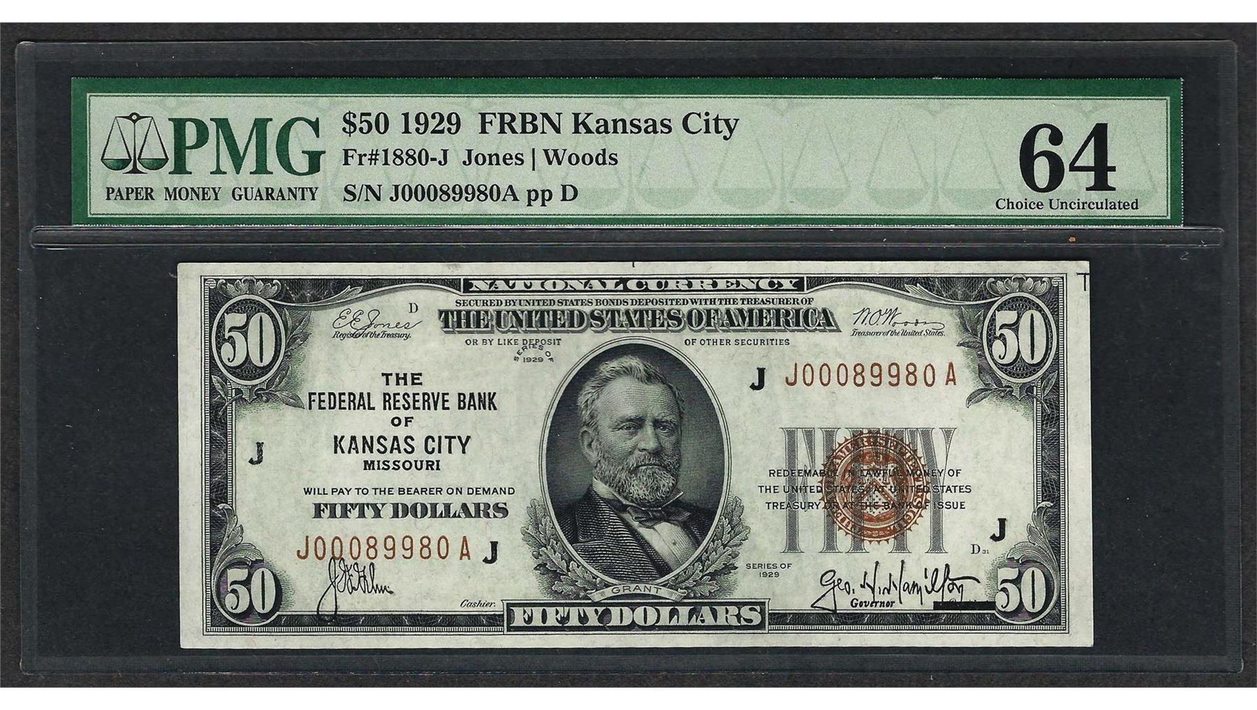 One 1929 $50 Federal Bank of Kansas City Note Fr.1880-J PMG Choice Uncirculated 64. PMG Certified.