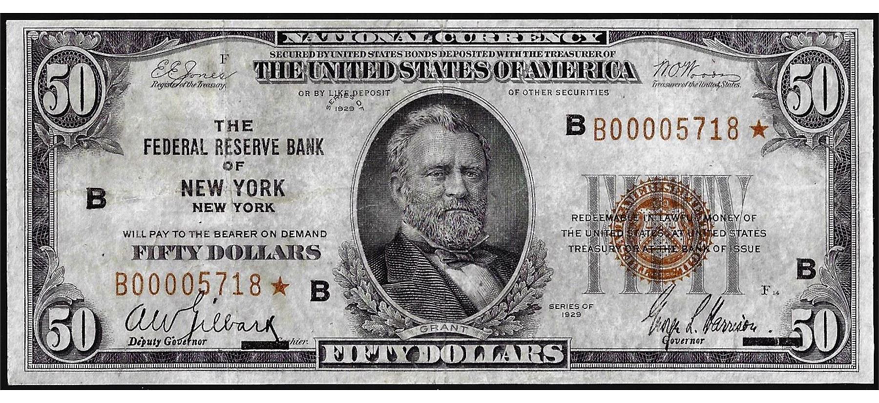 One 1929 $50 Federal Reserve Bank STAR Note New York.