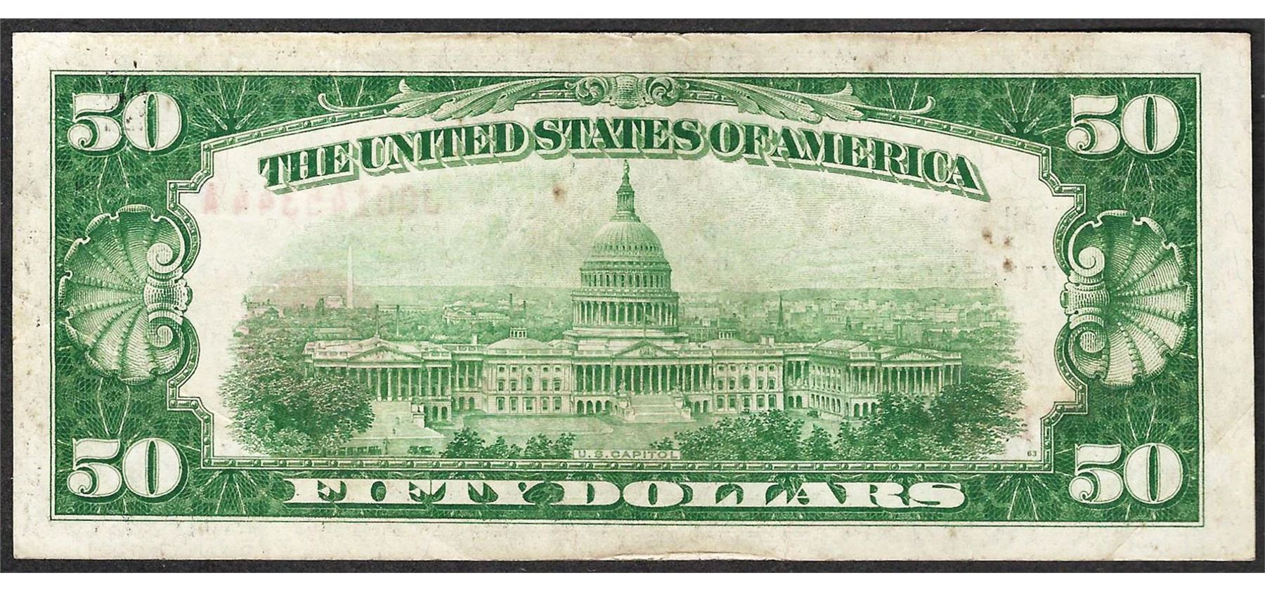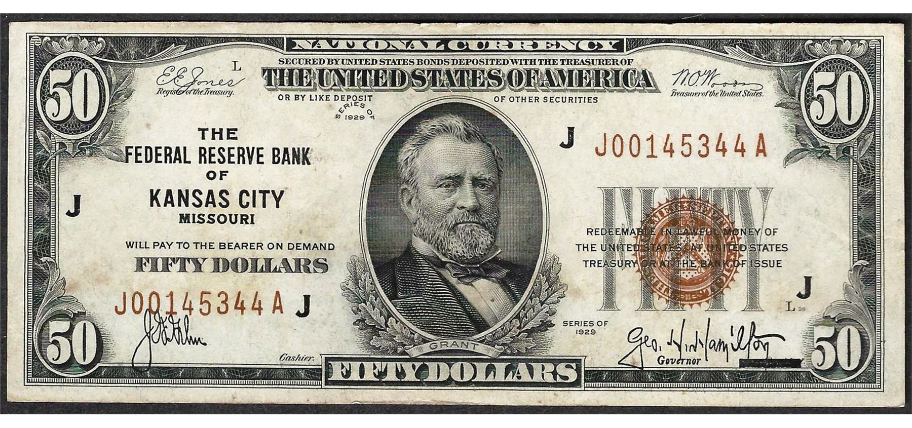 One 1929 $50 Federal Reserve Bank of Kansas City Note.