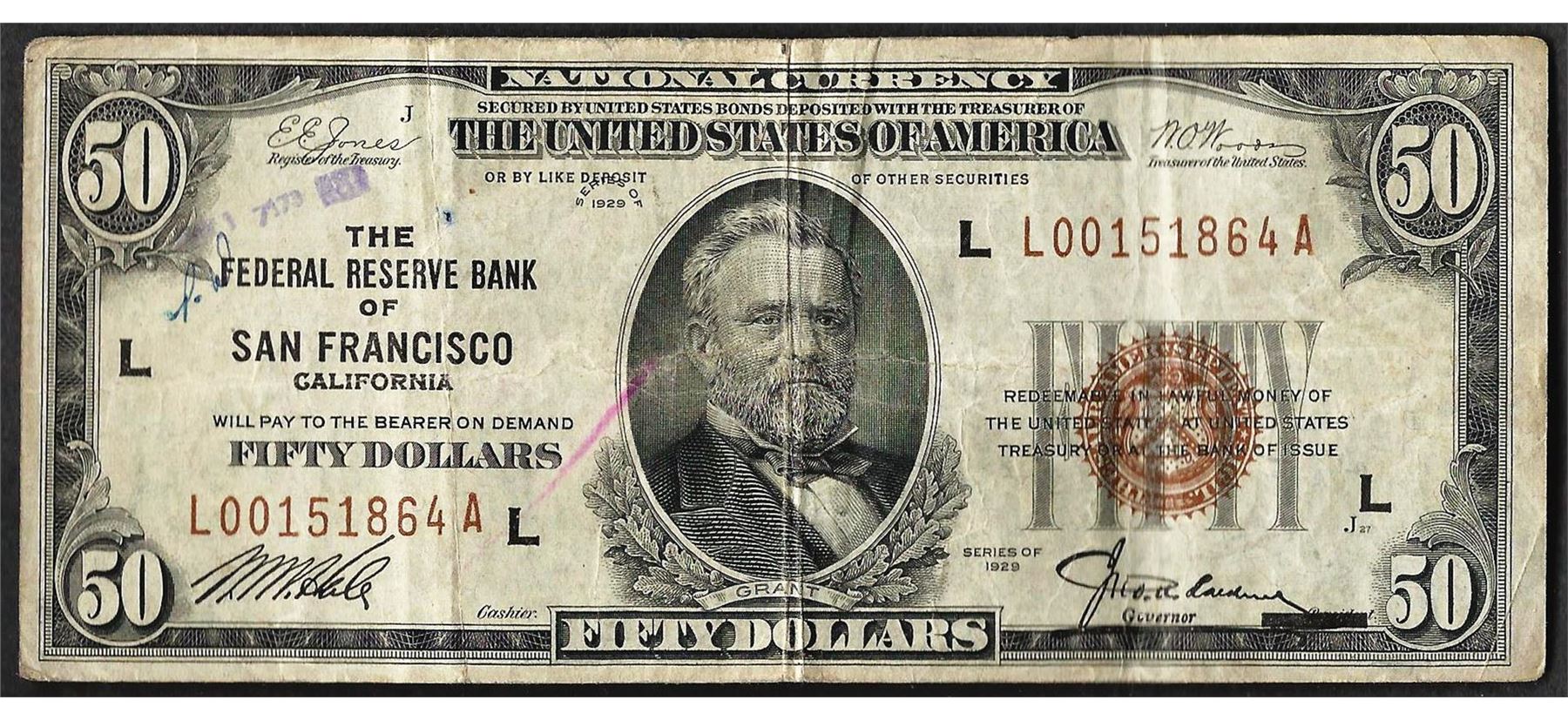 One 1929 $50 Federal Reserve Bank of San Francisco Note.