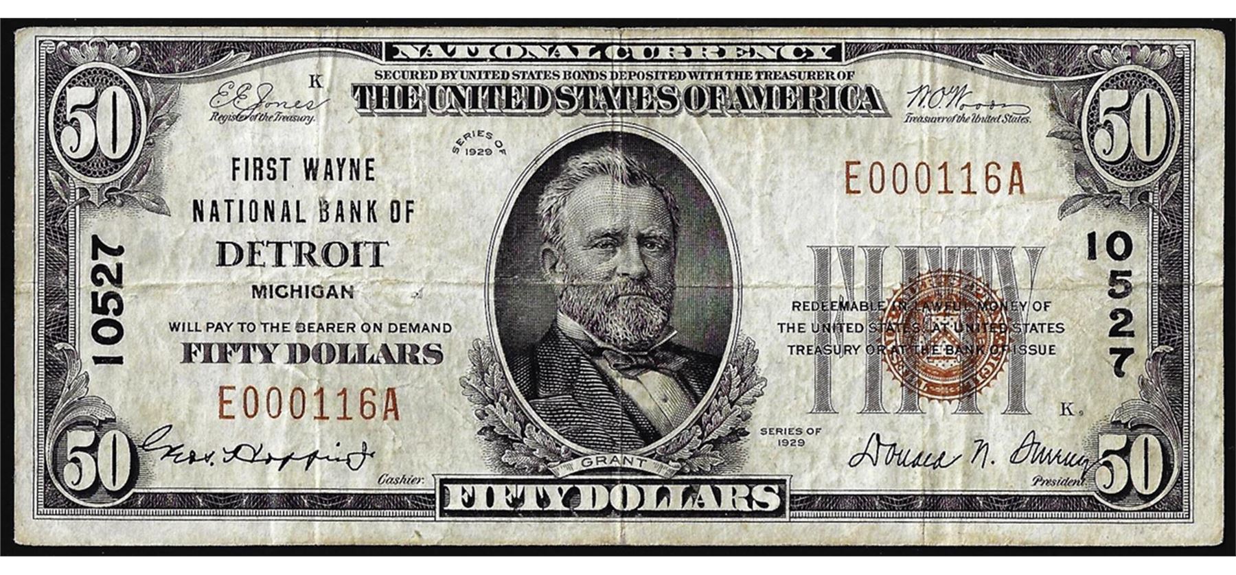 One 1929 $50 First Wayne NB of Detroit, MI CH# 10527 National Currency Note.