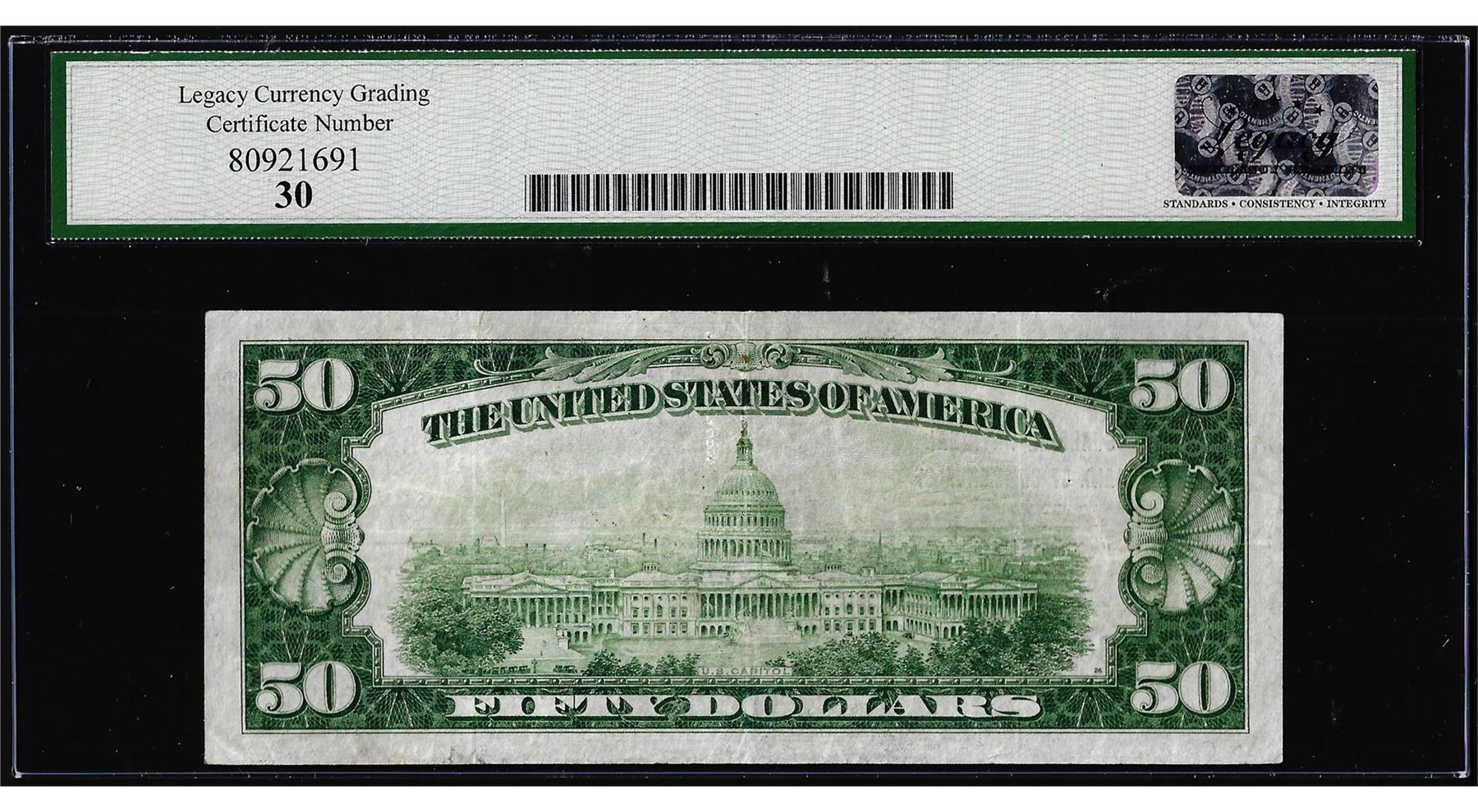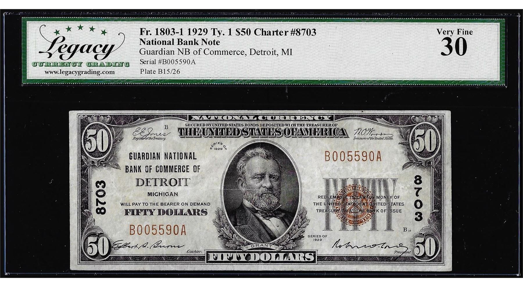One 1929 $50 Guardian NB Commerce Detroit, MI CH# 8703 National Currency Note Legacy VF30. Legacy Graded.