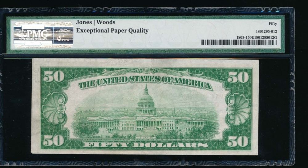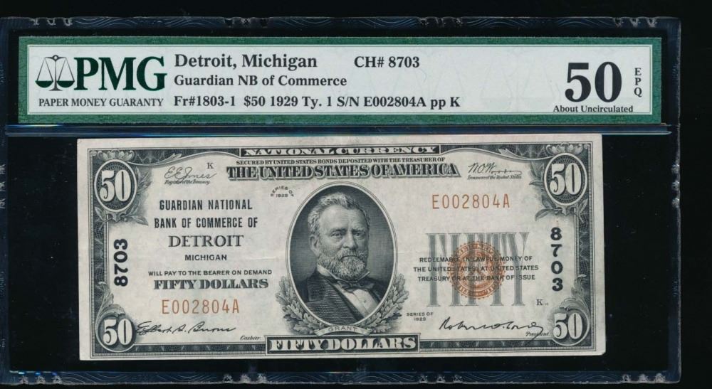 One 1929 $50 Guardian National Bank Note PMG 50EPQ.