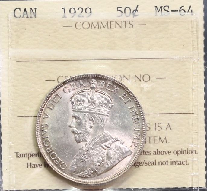1929 50¢ ICCS Choice Mint State-64. An atractive fully white and lustrous example.