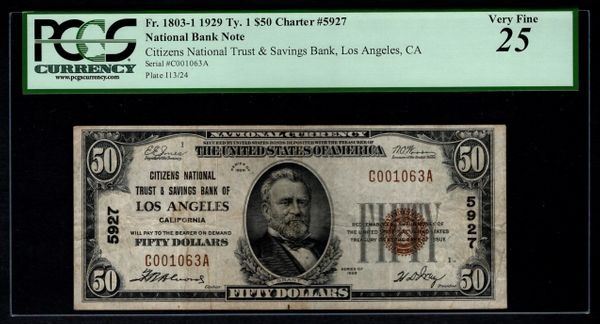 One 1929 $50 Los Angeles National Bank Note PCGS 25.