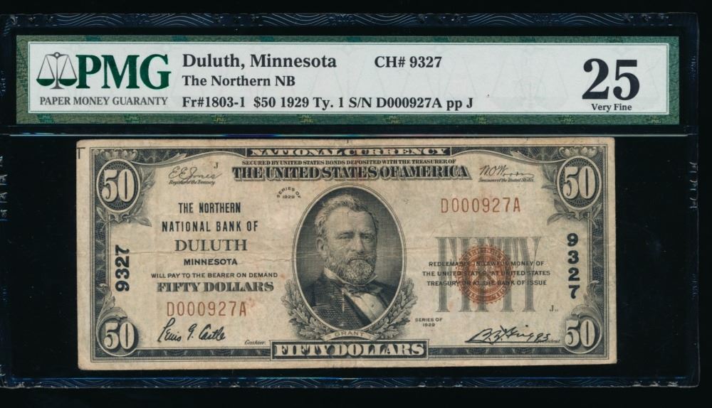 One 1929 $50 Low Serial Duluth MN National PMG 25.