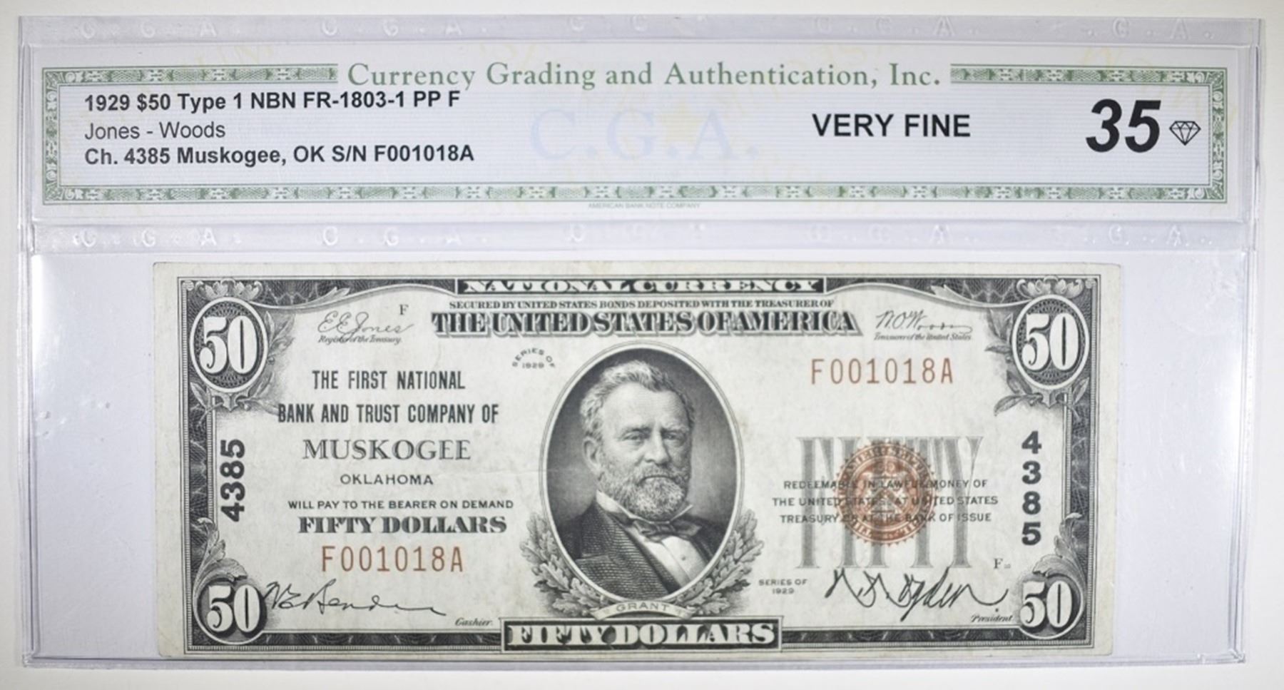 1ST NATIONAL BANK AND TRUST OF MUSKOGEE, OK.   VERY SCARCE HIGH DENOMINATION.   ESTIMATE  $775 - $825.