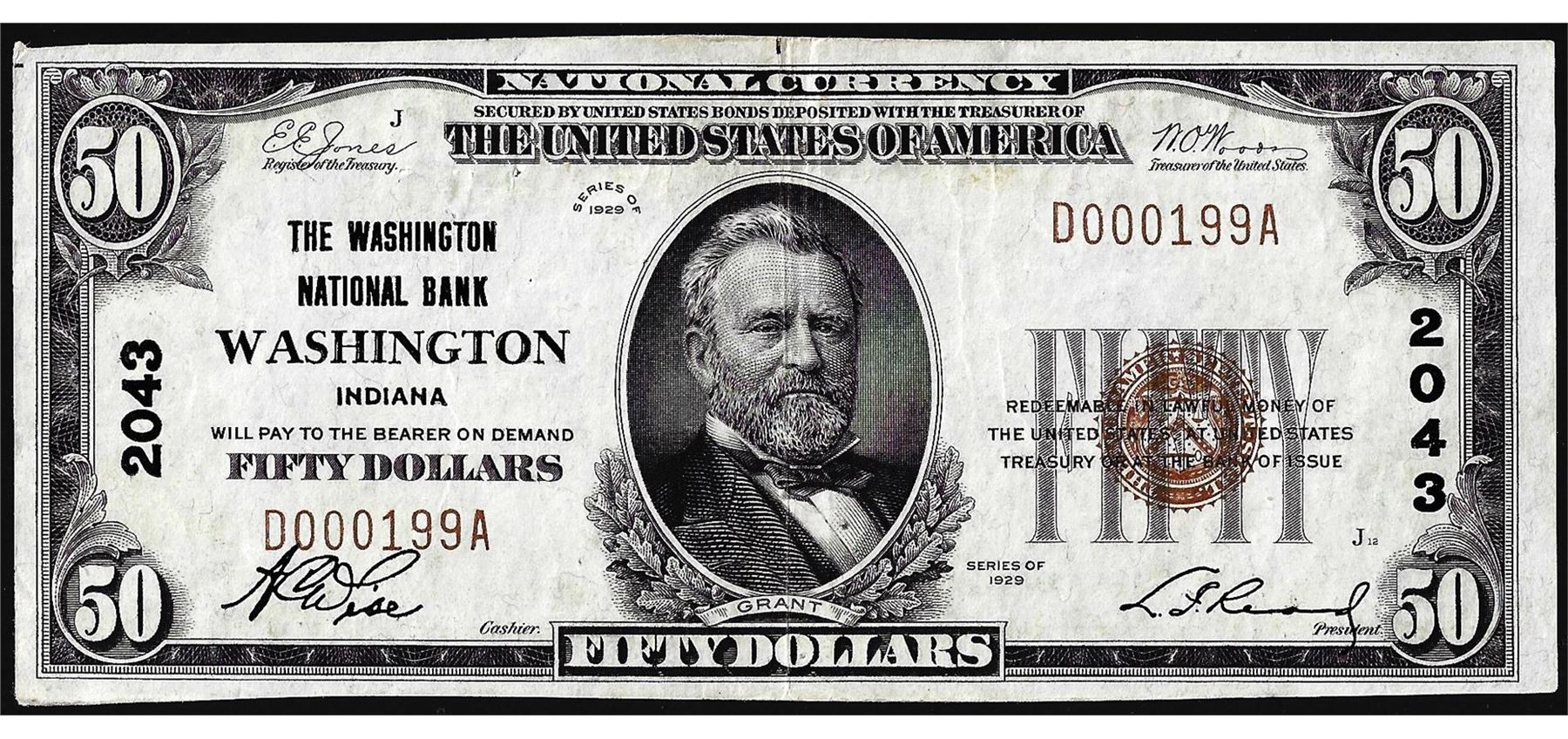 One 1929 $50 NB of Washington, District of Columbia CH# 2043 National Currency Note, there are a few pinholes in the middle area of the note.