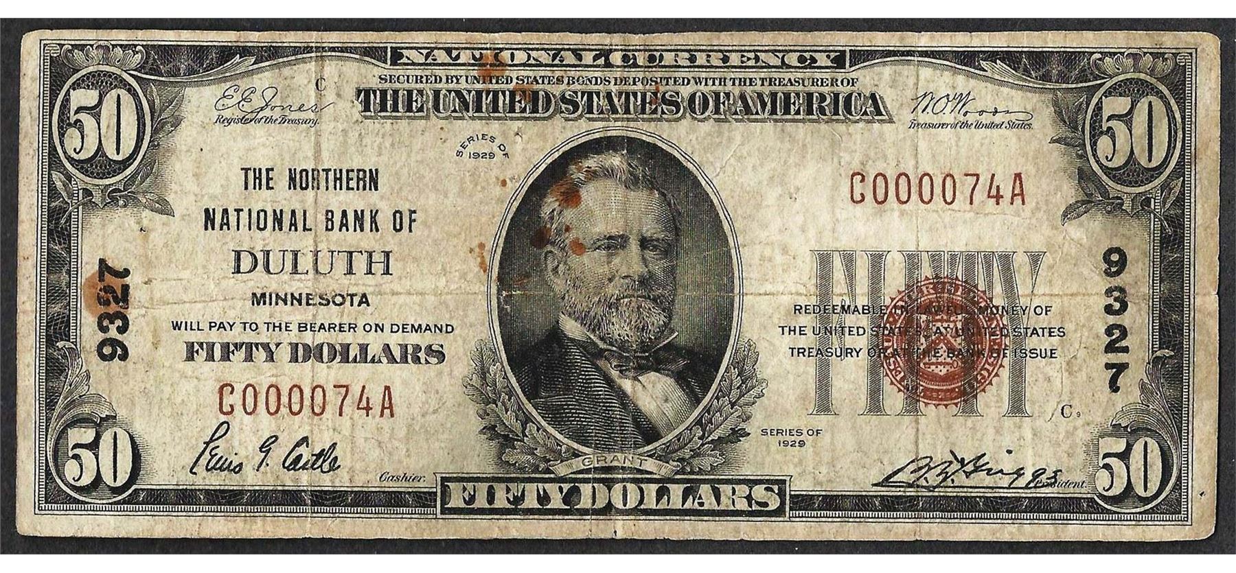 1929 $50 National Currency Note Duluth, MN CH# 9327 Low Serial Number